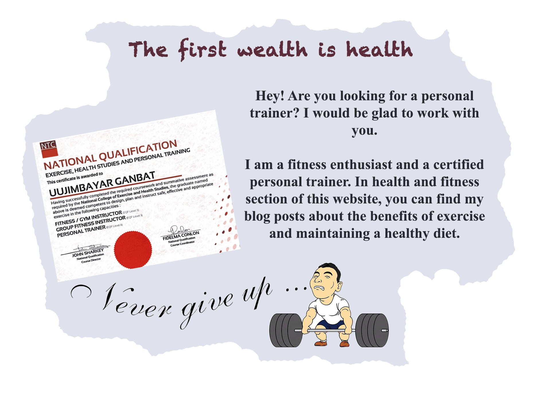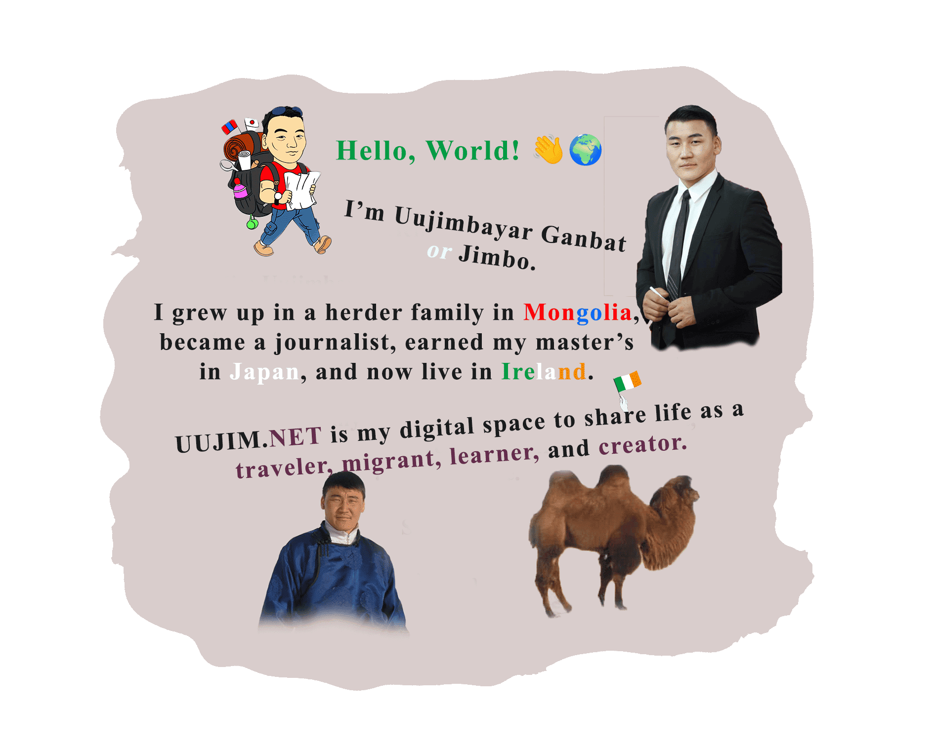 Намайг Ганбатын Уужимбаяр гэдэг. Англи нэр минь Жимбо. Уул усны сайханд, малчны гэрт өссөндөө үргэлж баярлаж явдаг. Азийн Хөгжлийн Банкны тэтгэлгээр Японы Нагоя сургуульд мастер хамгаалсан. Одоо мөнхийн ногоон арал, Ирландад ажиллаж, амьдарч байна. Ирландад фитнес дасгуулагч болох 3 сарын сургалтад сууж, төгссөн. Мөн дижитал маркетингийн чиглэлээр Ирландад мастерт сурсан. Хэзээ нэгэн цагт сурсан бүх зүйлсийнхээ хэргийг гаргана гэж бодож явдаг ЭГЭЛ нэгэн залуу байна. UUJIM.NET бол миний үзэл бодол, туршлага, алдаа, оноо, сурсан зүйлээ бусадтай хуваалцаж буй орон зай. Танд амжилт хүсье. Эрүүл, жаргалтай байгаарай.