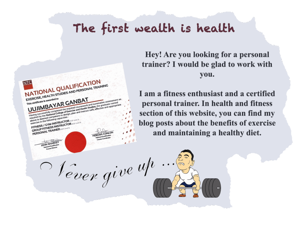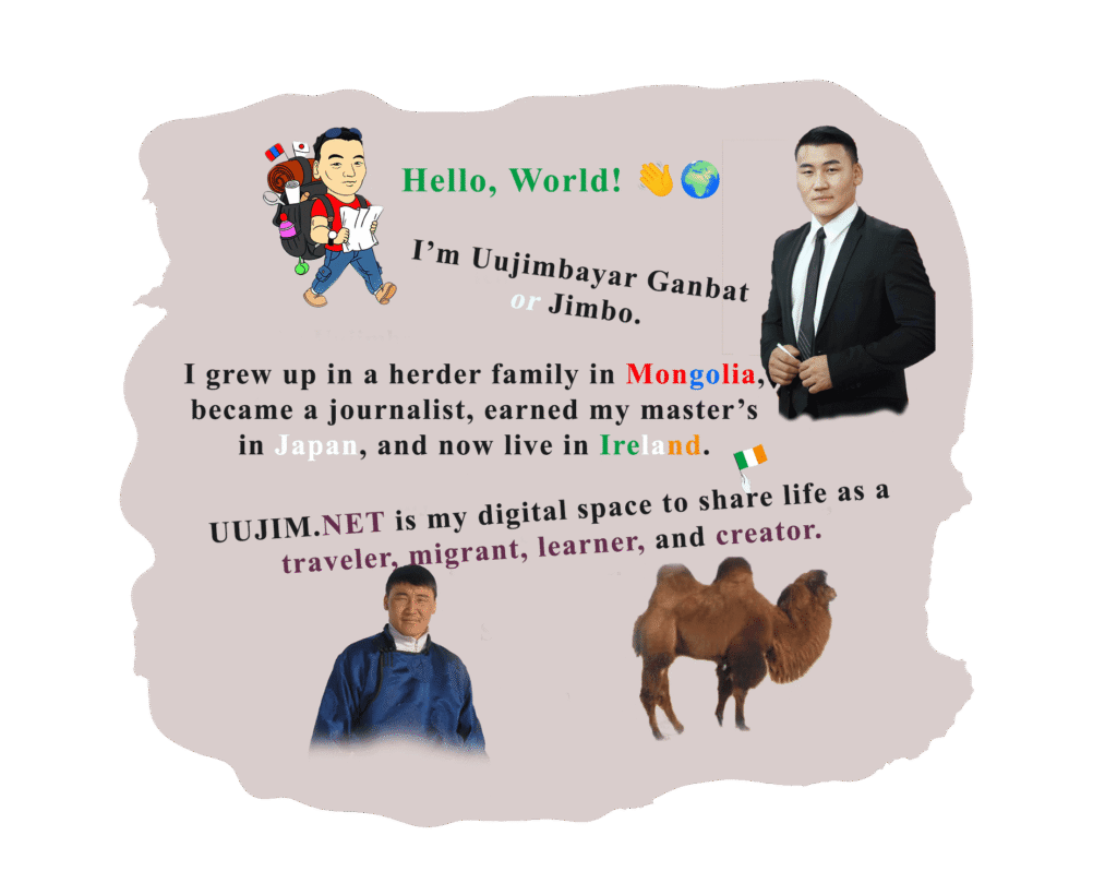 Намайг Ганбатын Уужимбаяр гэдэг. Англи нэр минь Жимбо. Уул усны сайханд, малчны гэрт өссөндөө үргэлж баярлаж явдаг. Азийн Хөгжлийн Банкны тэтгэлгээр Японы Нагоя сургуульд мастер хамгаалсан. Одоо мөнхийн ногоон арал, Ирландад ажиллаж, амьдарч байна. Ирландад фитнес дасгуулагч болох 3 сарын сургалтад сууж, төгссөн. Мөн дижитал маркетингийн чиглэлээр Ирландад мастерт сурсан. Хэзээ нэгэн цагт сурсан бүх зүйлсийнхээ хэргийг гаргана гэж бодож явдаг ЭГЭЛ нэгэн залуу байна. UUJIM.NET бол миний үзэл бодол, туршлага, алдаа, оноо, сурсан зүйлээ бусадтай хуваалцаж буй орон зай. Танд амжилт хүсье. Эрүүл, жаргалтай байгаарай.